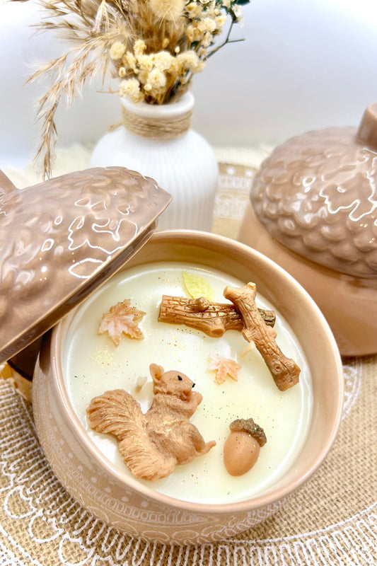 Eichelkerze „Mini-Herbstzauber“ – Eichhörnchen & Blätter in liebevoller Keramikdose 🍂🧡