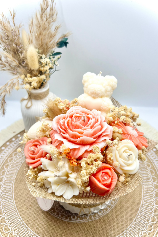 Herbst Blumenstrauß Kerze – Handgemachter Deko-Strauß mit Blüten, Kürbis & Igel