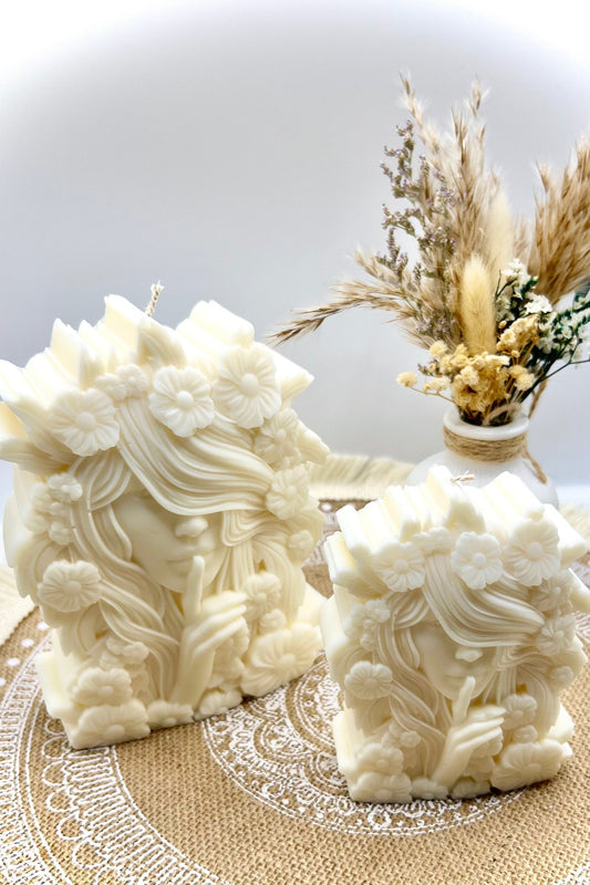 “Flower Goddess” – Skulpturkerze mit floraler Magie | Handgegossene Göttin in Cremeweiß oder farblich abgesetztem Blüten-Design