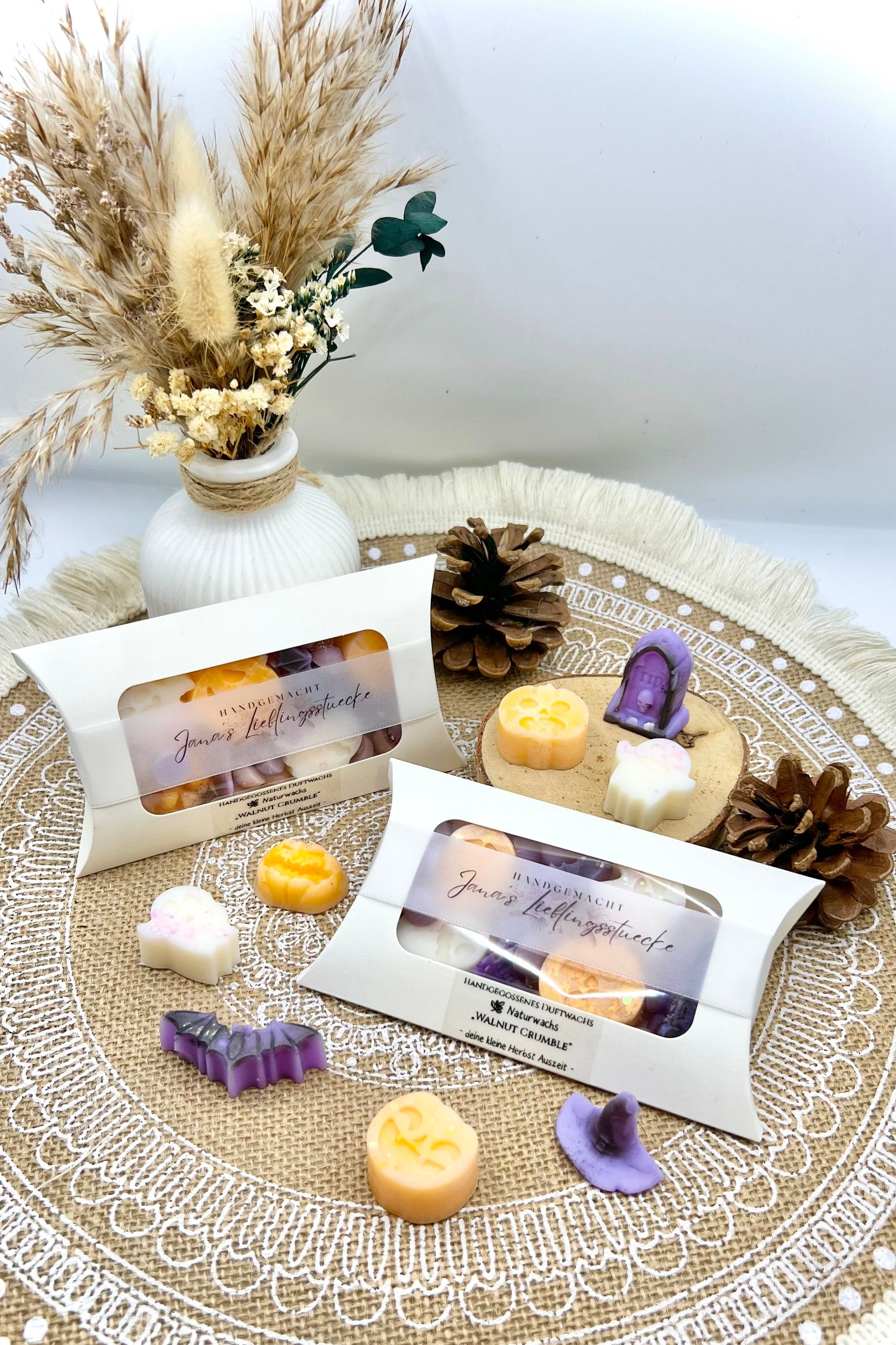 • Walnut Maple Crumble – Halloween Edition 🎃 – nussig-süß mit Hafer, Kürbisgewürzen, Zimt und Nelke, abgerundet durch Vanille, Buttercreme und Muskat. Gegossen in kleinen Halloween-Motiven wie Kürbissen, Geistern oder Fledermäusen – jede Packung ein liebevoller Überraschungsmix für noch mehr Herbstzauber.