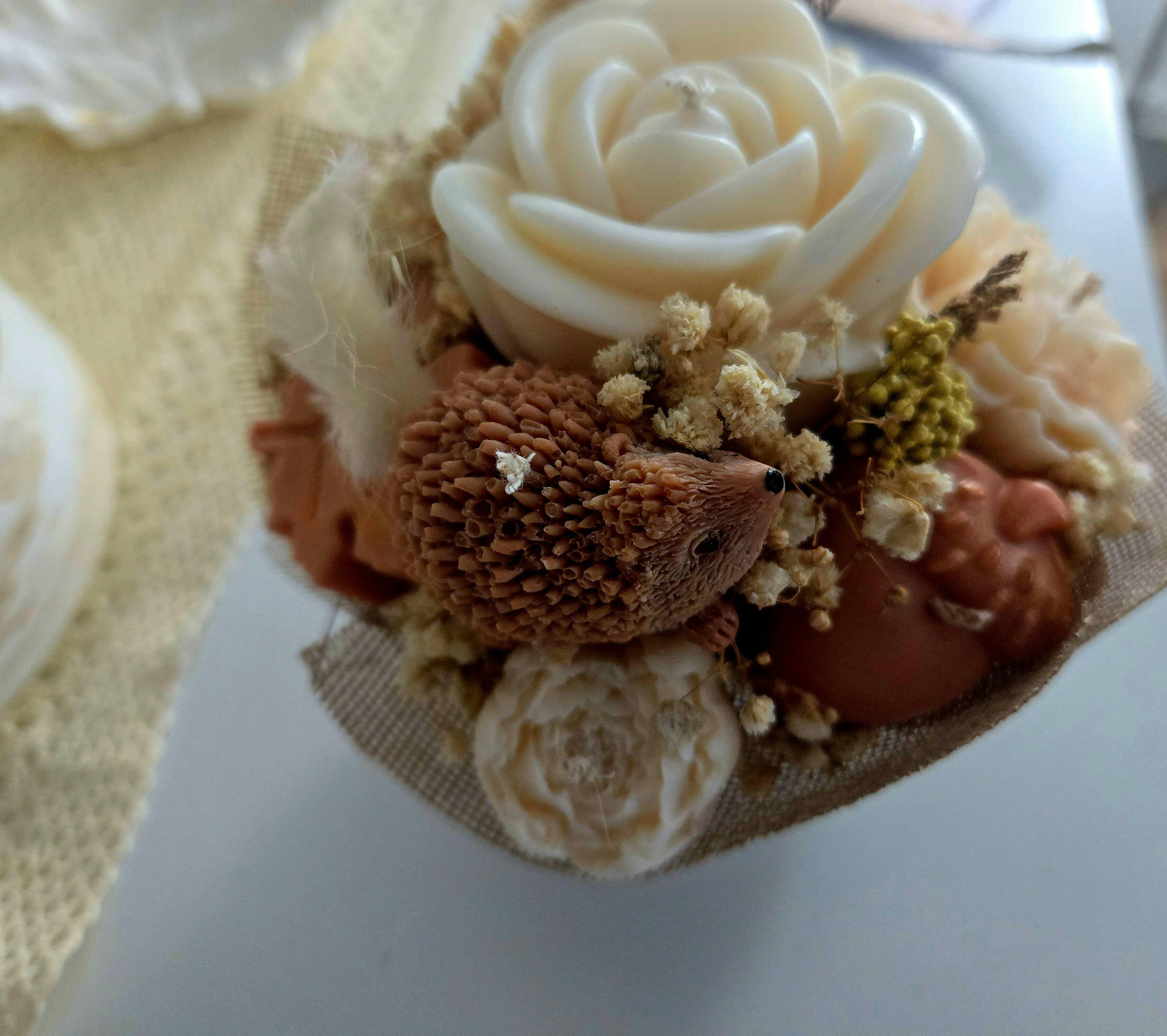 Tauche ein in die goldene Jahreszeit mit unseren handgefertigten Kerzen-Blumensträußen im Herbstlook. Liebevoll arrangiert mit detailreichen Blüten, zarten Blättern, einem kleinen Kürbis und einem niedlichen Igel – alles aus einer nachhaltigen Sojawachs-Pflanzenwachsmischung von Hand gegossen. Jeder Strauß ist ein Unikat, das Wärme und Gemütlichkeit in dein Zuhause bringt.
