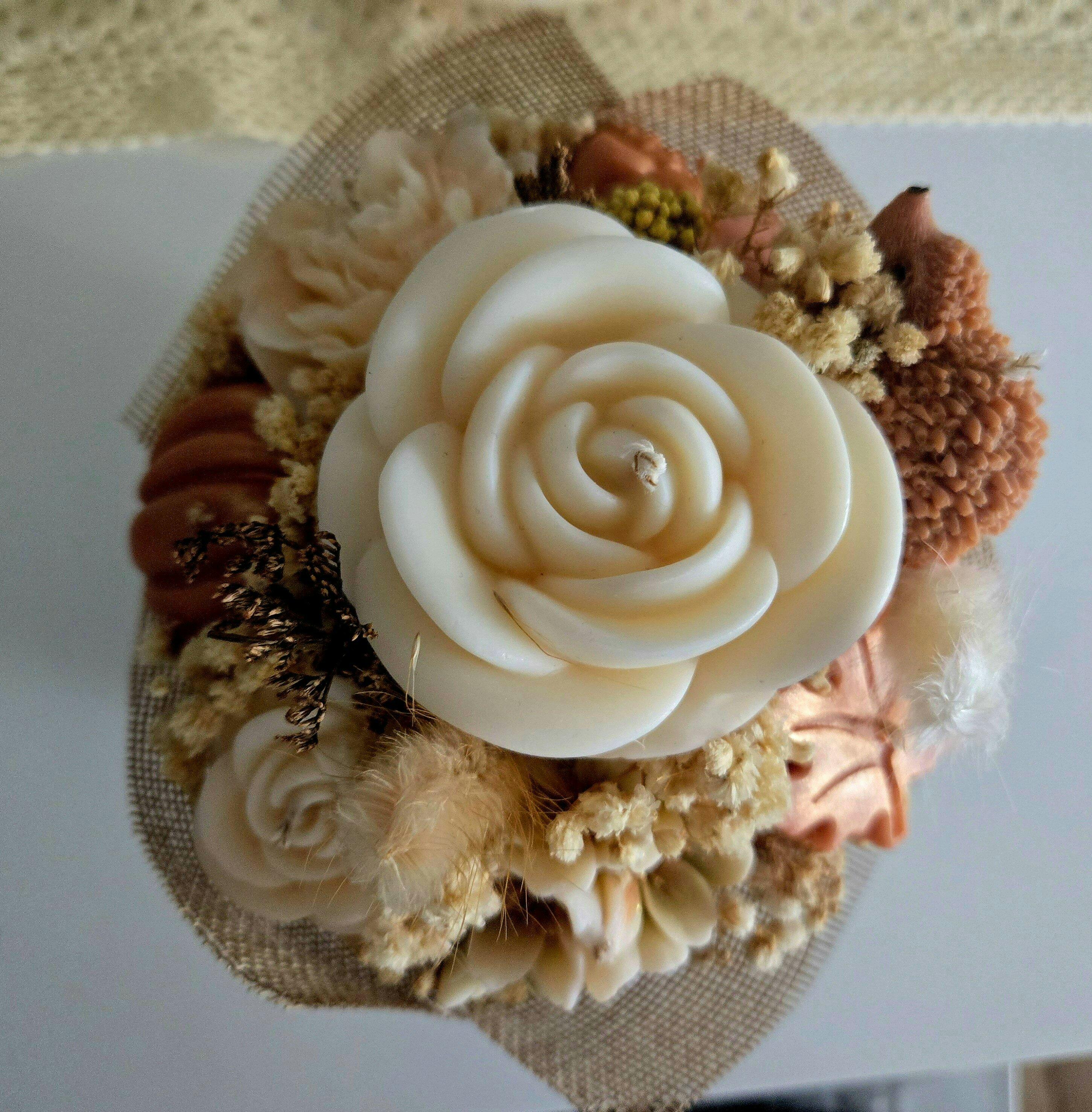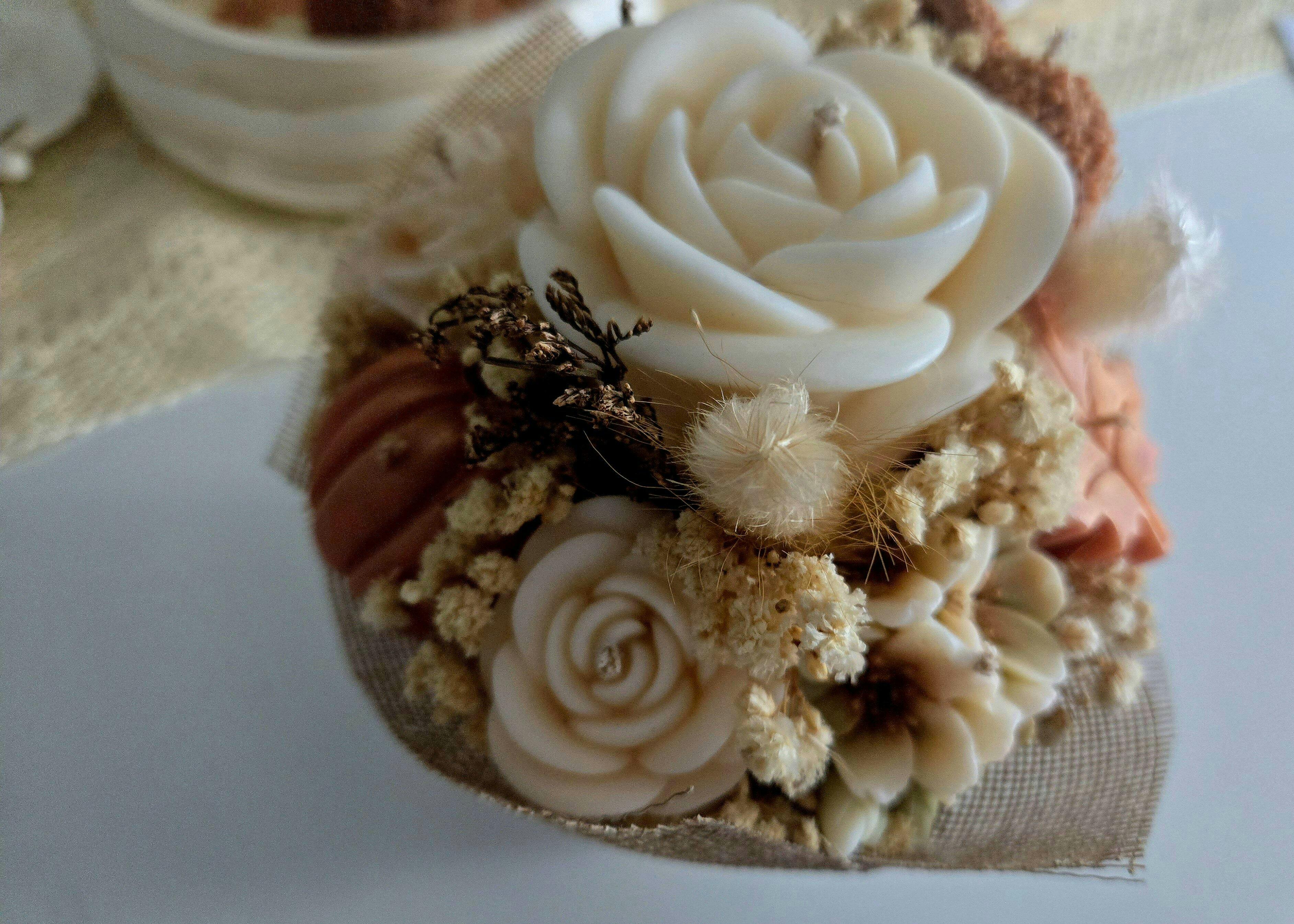 Herbst Blumenstrauß Kerze – Handgemachter Deko-Strauß mit Blüten, Kürbis & Igel