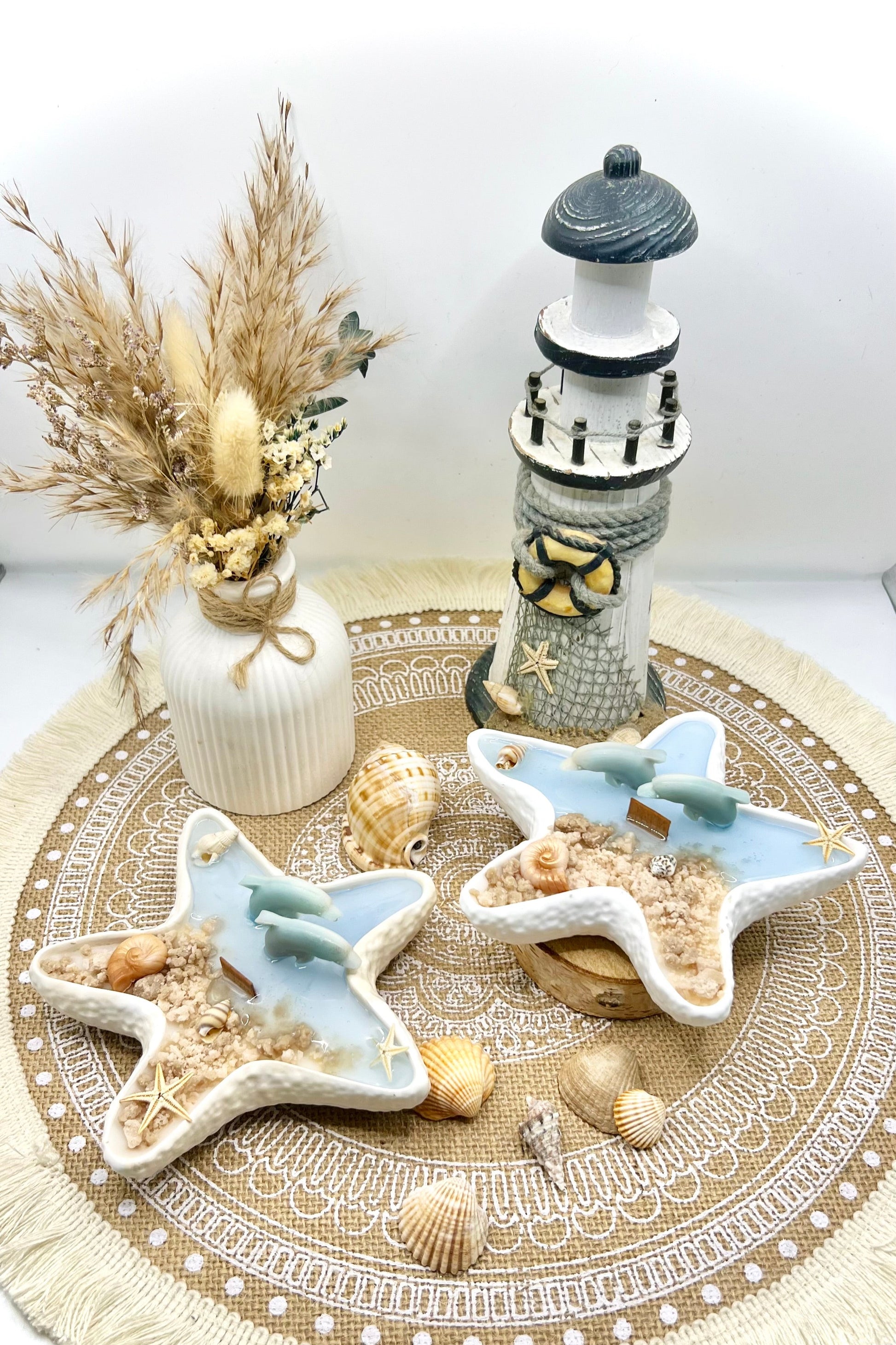 Diese detailverliebte Duftkerze im Seestern-Design ist wie ein kleiner Küstenmoment, eingefangen in Wachs und Keramik. Wähle zwischen einer Schildkröte, die gemächlich durchs Wasser gleitet, oder verspielten Delfinen, die durch sanfte Wellen springen.