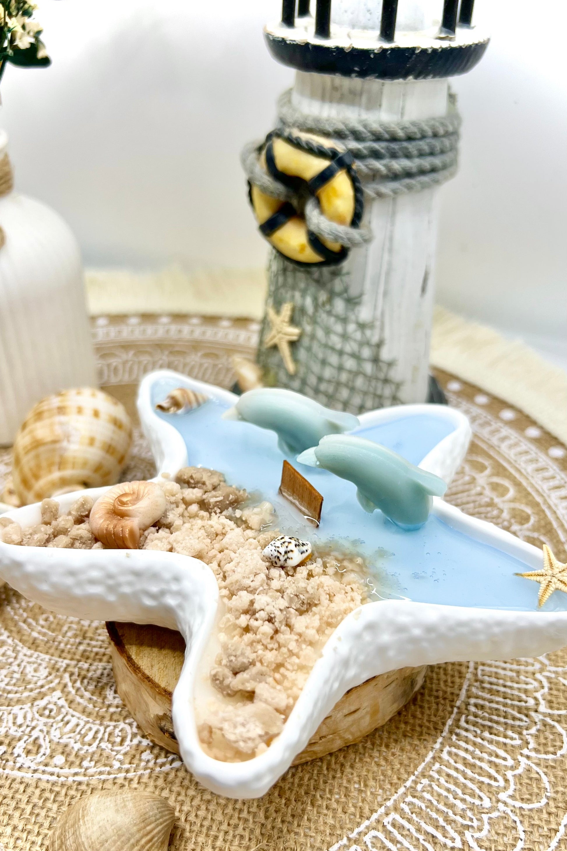 Küstenmoment – Duftkerze im Seestern | Schildkröte oder Delfine | Handgegossen mit maritimen Details