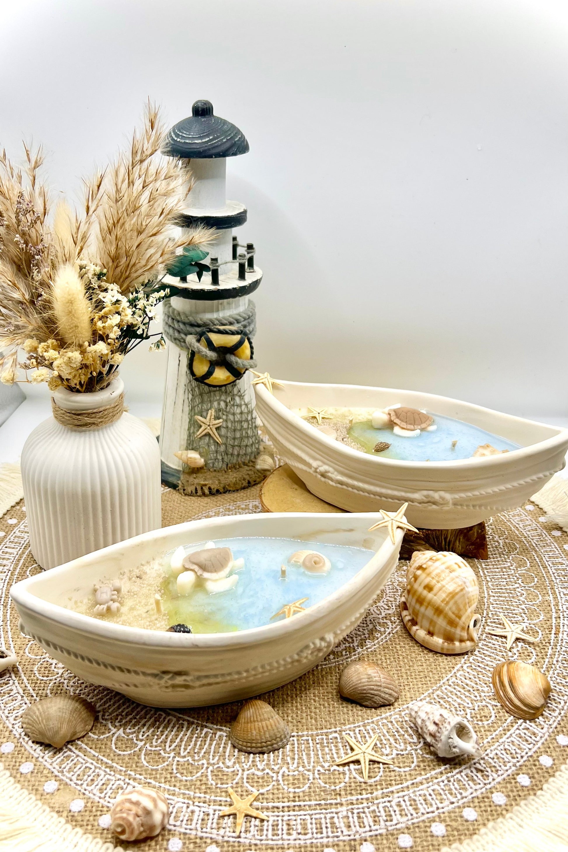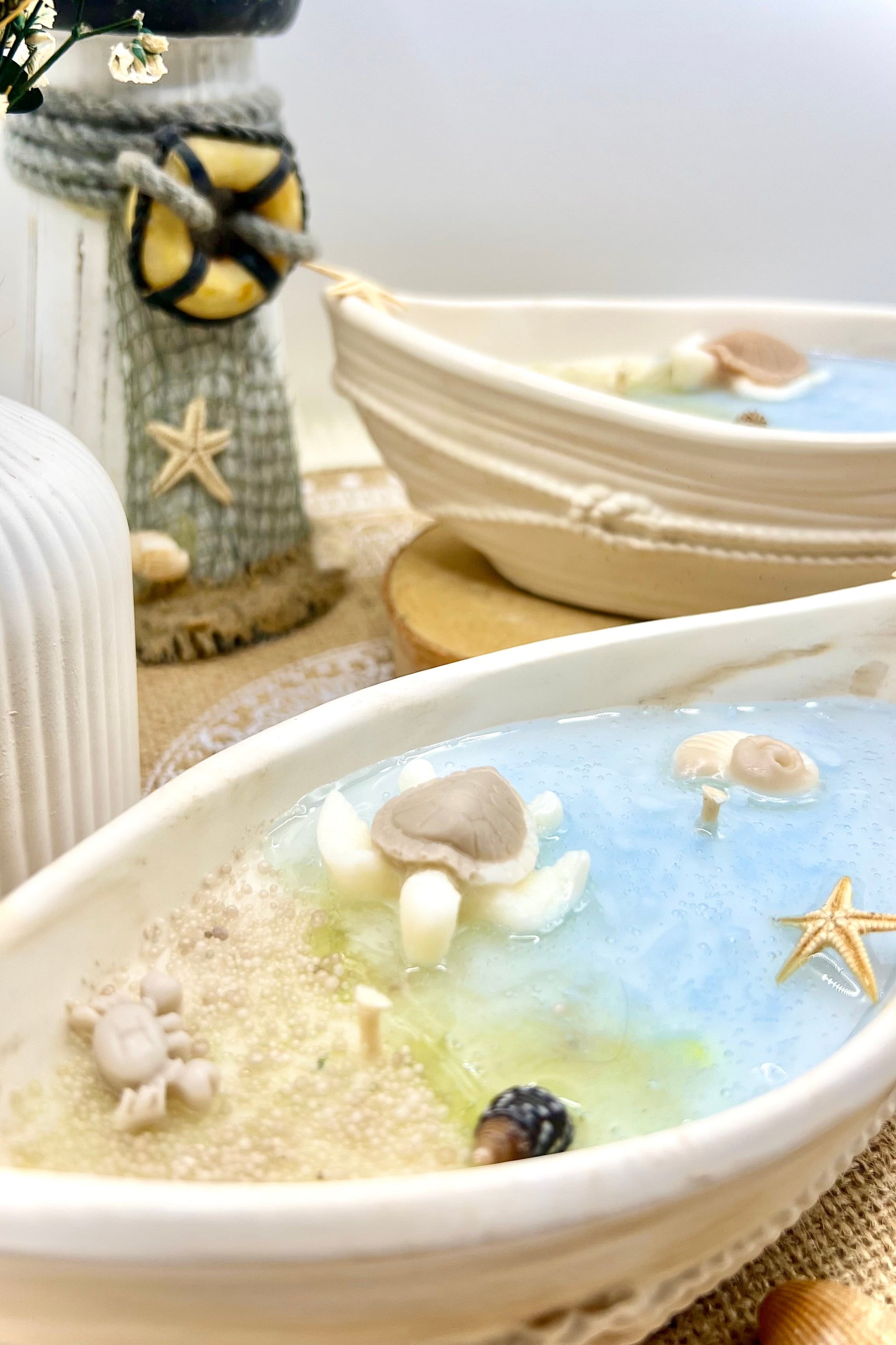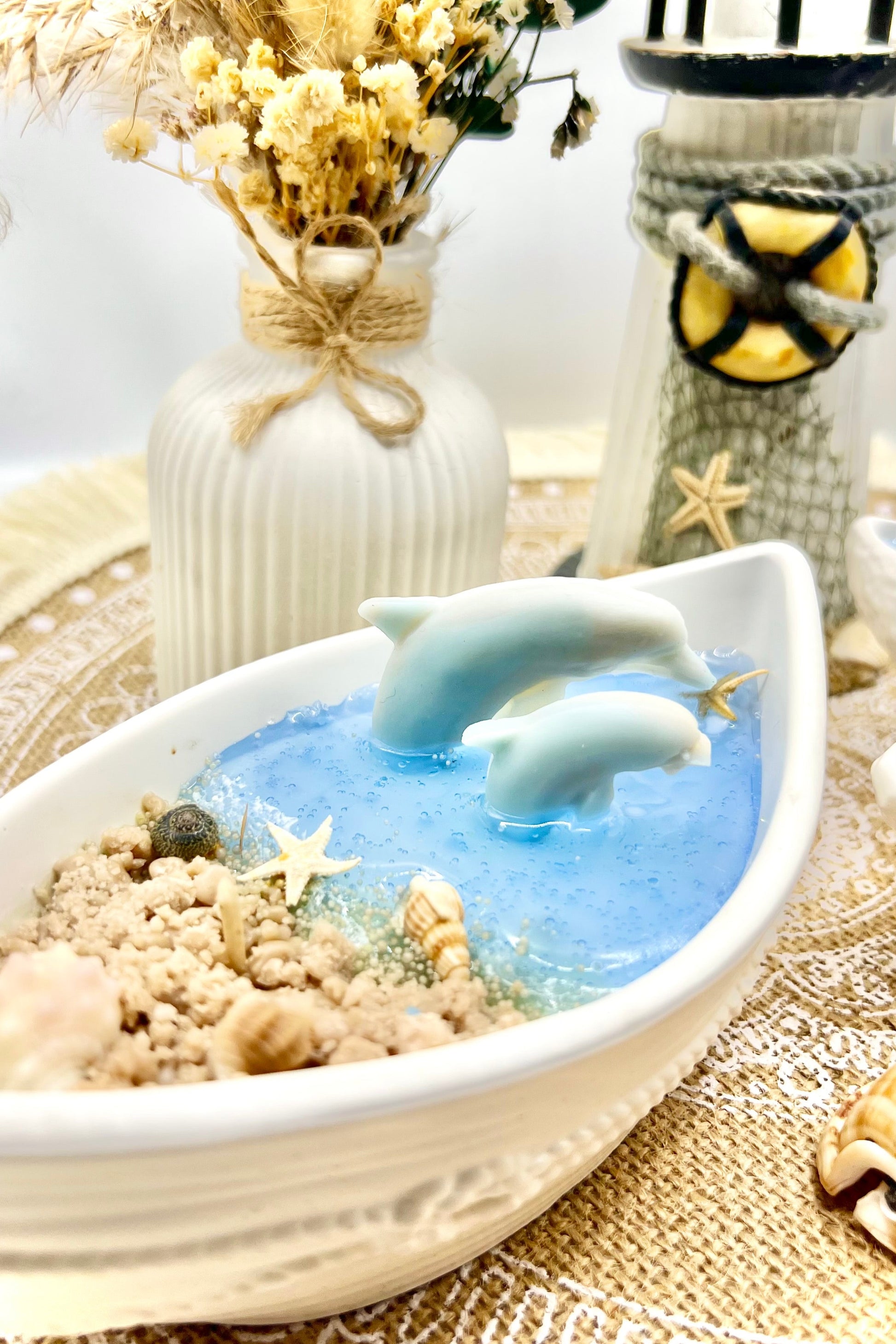 Die maritime Szene ist eingebettet in ein hochwertiges, mit viel Liebe gegossenes Keramikboot – erhältlich in elegantem Weiß oder sanft marmorierter Optik. Der „Strand“ besteht aus echtem Kerzensand, kombiniert mit handverlesenen Details und wird in mehreren Schichten gegossen – mit meiner bewährten Pflanzen-Mineralien-Wachsmischung und klarem Gelwachs für den perfekten Meereslook. 🥰🐬