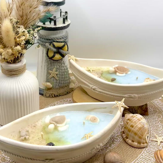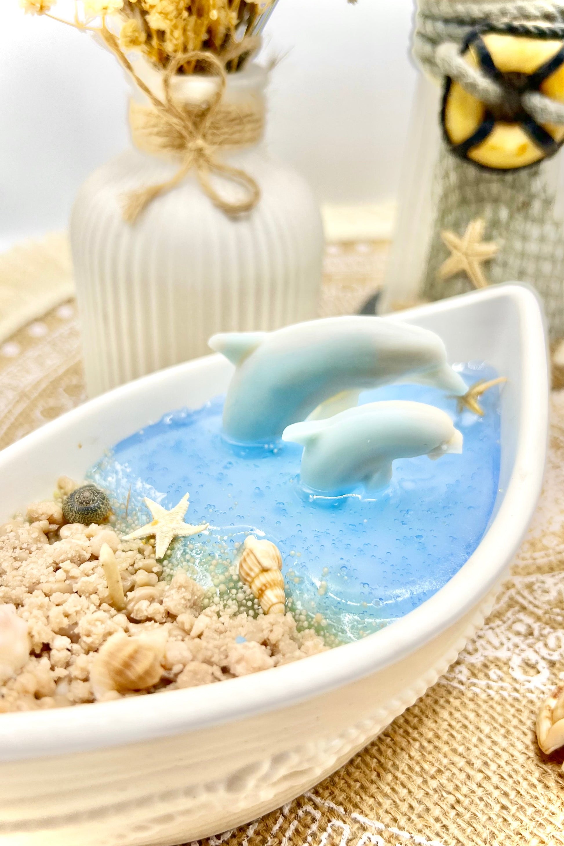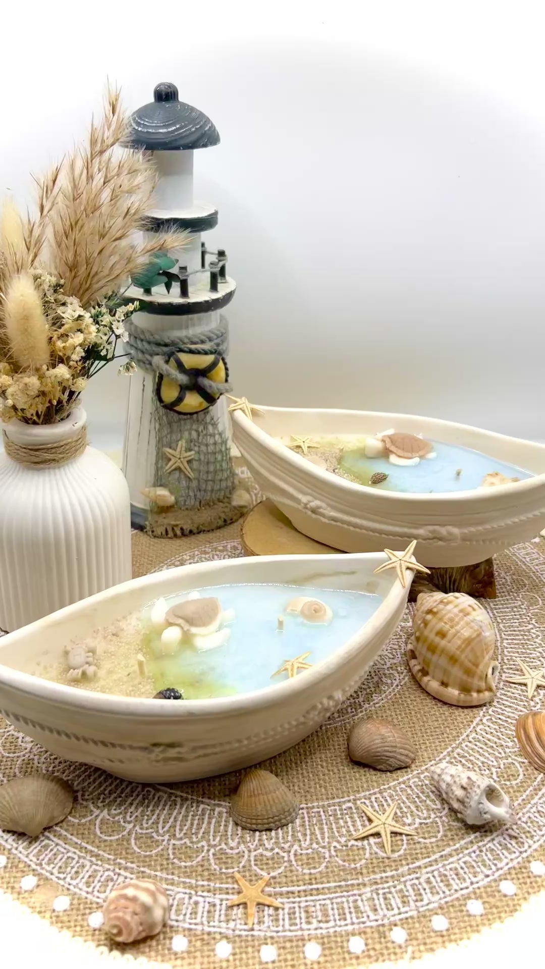 Die maritime Szene ist eingebettet in ein hochwertiges, mit viel Liebe gegossenes Keramikboot – erhältlich in elegantem Weiß oder sanft marmorierter Optik. Der „Strand“ besteht aus echtem Kerzensand, kombiniert mit handverlesenen Details und wird in mehreren Schichten gegossen – mit meiner bewährten Pflanzen-Mineralien-Wachsmischung und klarem Gelwachs für den perfekten Meereslook. 🥰🐬