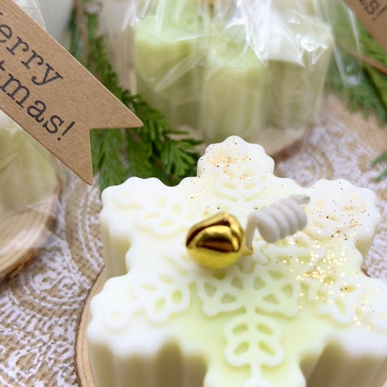 Winterkerze „Snowflake“ – handgegossene Schneeflocke mit Glöckchen, 4 Varianten