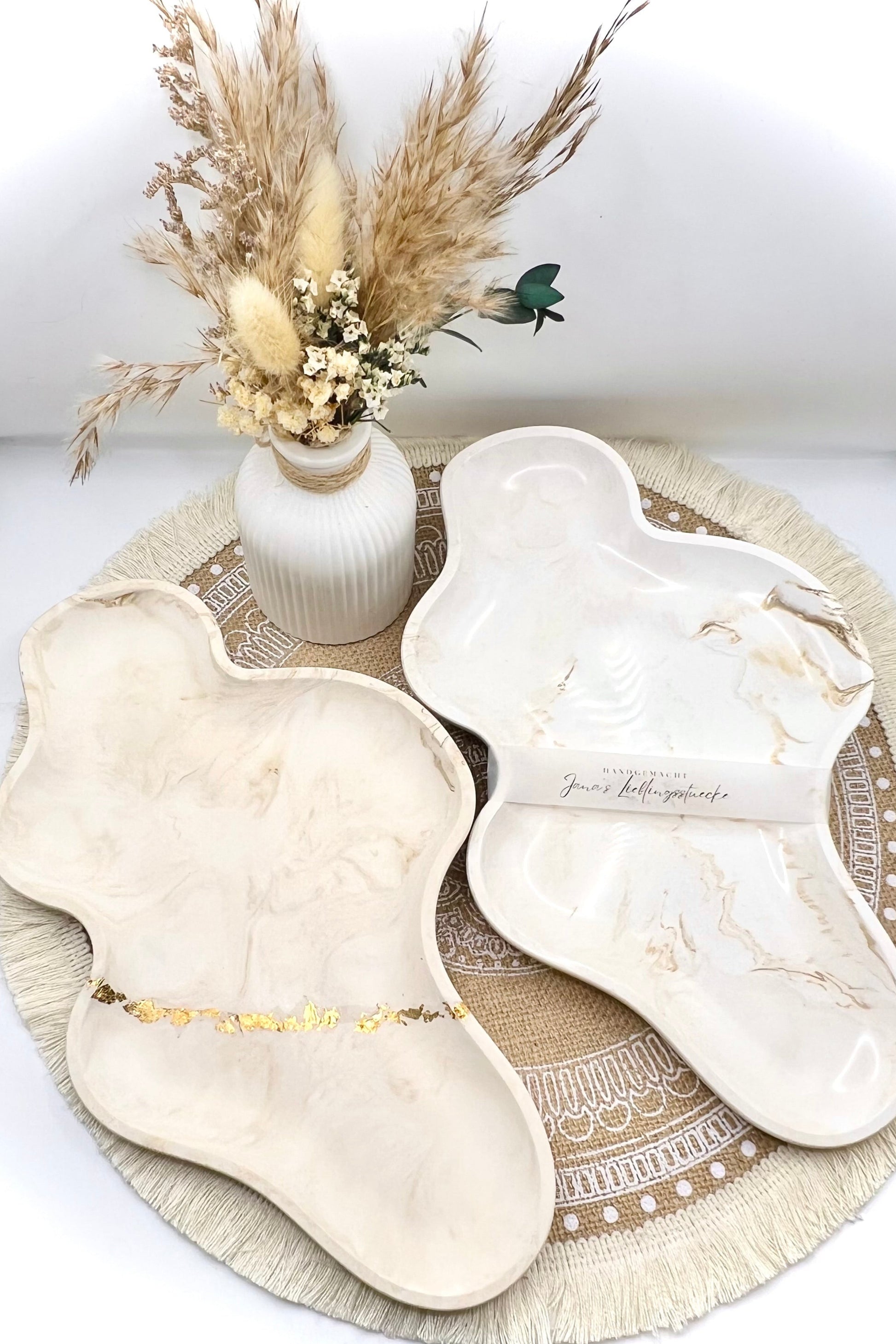 Dieses Wolkentablett bringt sanfte Formen und ruhige Farben in dein Zuhause. Jedes Stück ist ein handgefertigtes Unikat mit natürlicher Marmorierung in zartem Cremeton – wahlweise pur oder veredelt mit feinen Blattgold-Details für einen Hauch von Eleganz.